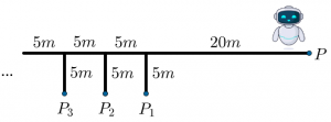 PROBLEMA O primeiro trajeto de um robô consiste em partir do ponto [tex]P[/tex], ir até o ponto [tex]P_1[/tex] e retornar ao ponto [tex]P[/tex], percorrendo [tex]50\ m[/tex]. No segundo trajeto deve ir do ponto [tex]P[/tex] ao ponto [tex] P_2[/tex] e retornar novamente ao ponto [tex]P[/tex], percorrendo desta vez [tex]60\ m[/tex] e, assim sucessivamente. Sabendo que o …