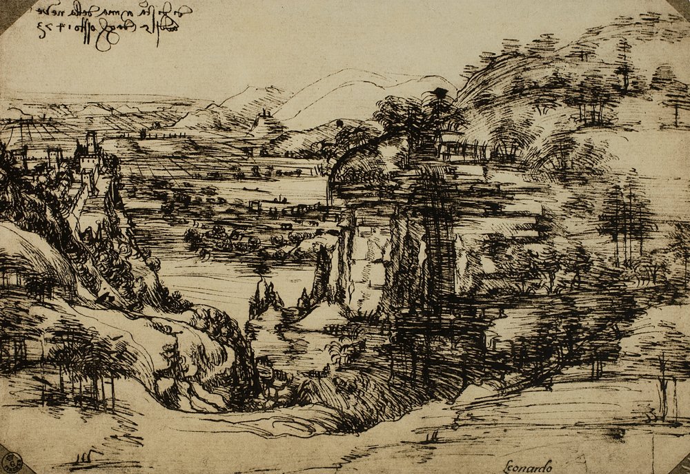 Paisagem do Vale do Arno, caneta sobre papel, Leonardo da Vinci (1452-1519)