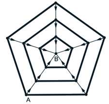 PROBLEMA Uma pesquisadora estuda o deslocamento de uma aranha sobre uma teia artística com formato pentagonal, utilizada em uma instalação de arte urbana. A teia é formada por três anéis pentagonais concêntricos ligados por segmentos radiais (um em cada vértice), como na figura. A aranha parte do vértice A do anel exterior e quer chegar …